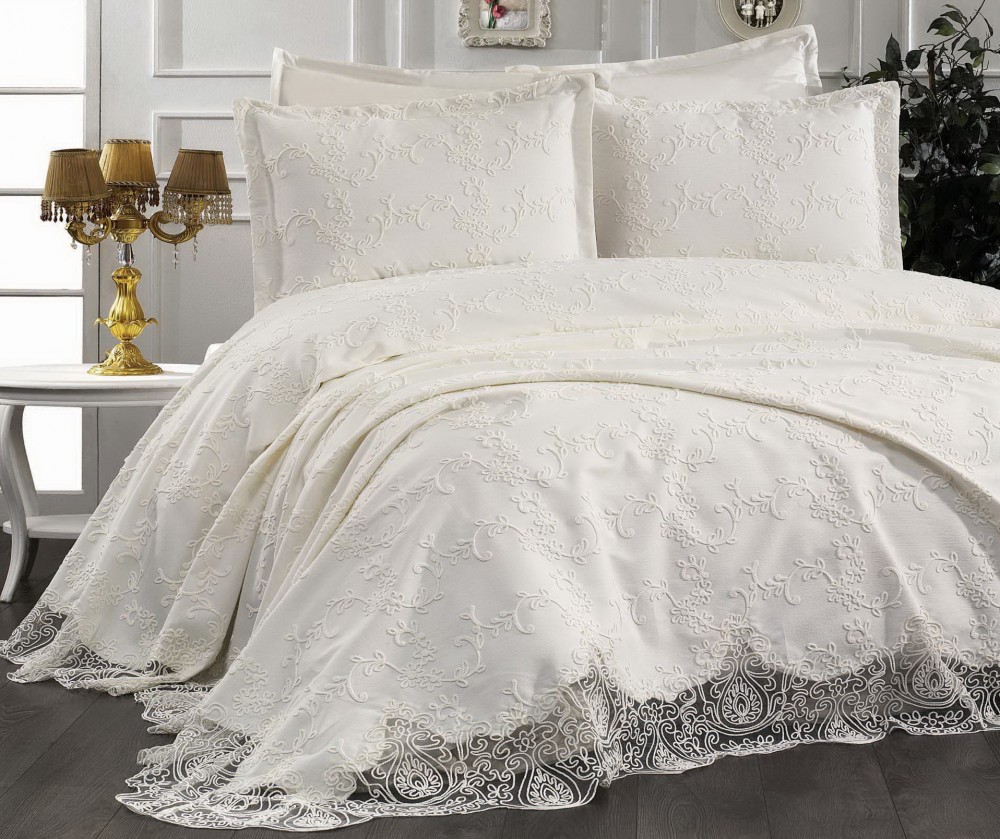 Cuvertura are culoarea crem si are model stantat clasic cu flori.