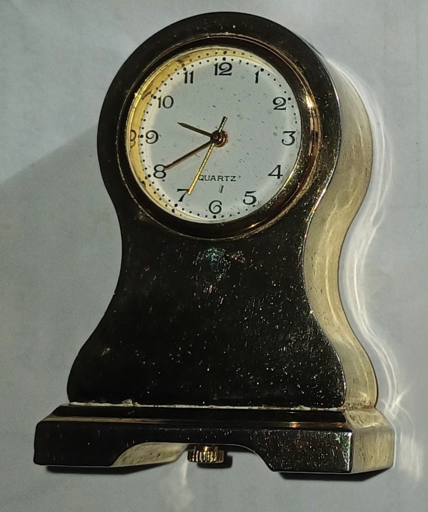 Ceas, quartz, in miniatura, de tip "pendula de podea" - metal neferos, aurit; functional, dar ii trebuie baterie noua; D cadran: 2 cm; H: 5 cm; 95 g; stare foarte buna, estetica frumoasa (foto); se asaza perfect, pe o suprafata orizontala plana; nu prezinta vreun marcaj.
