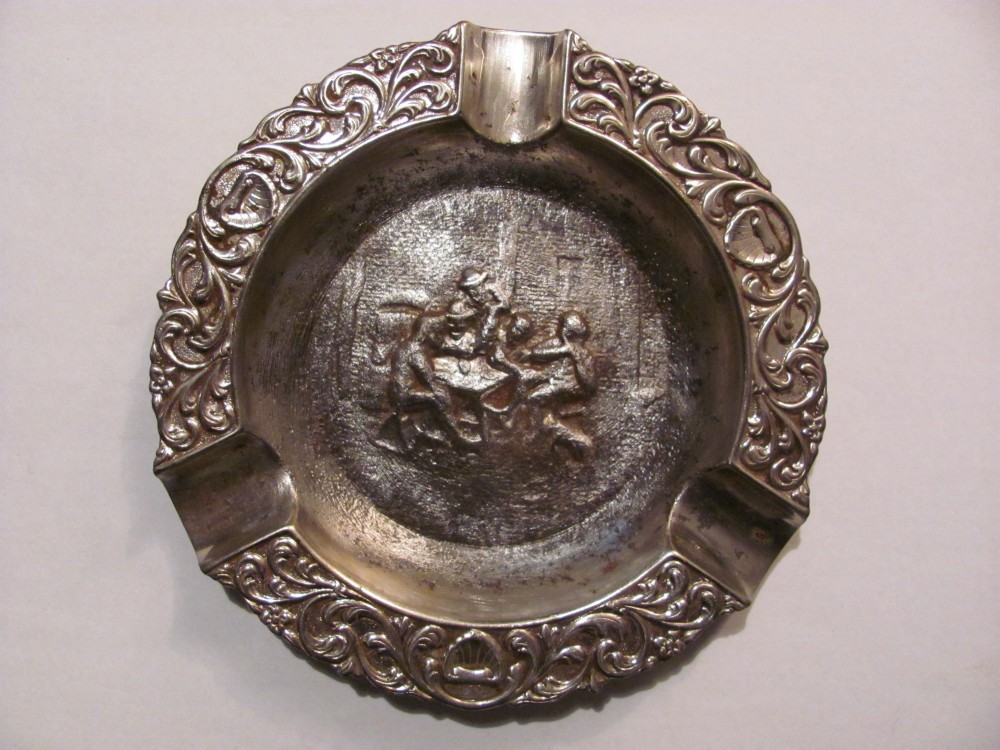 Scrumiera, fumata, mai veche; asa cum a fost gasita - nichel (sau metal nichelat); diametru: 14 cm; 115 g; stare buna, estetica frumoasa (foto); articolul nu prezinta vreun marcaj.
