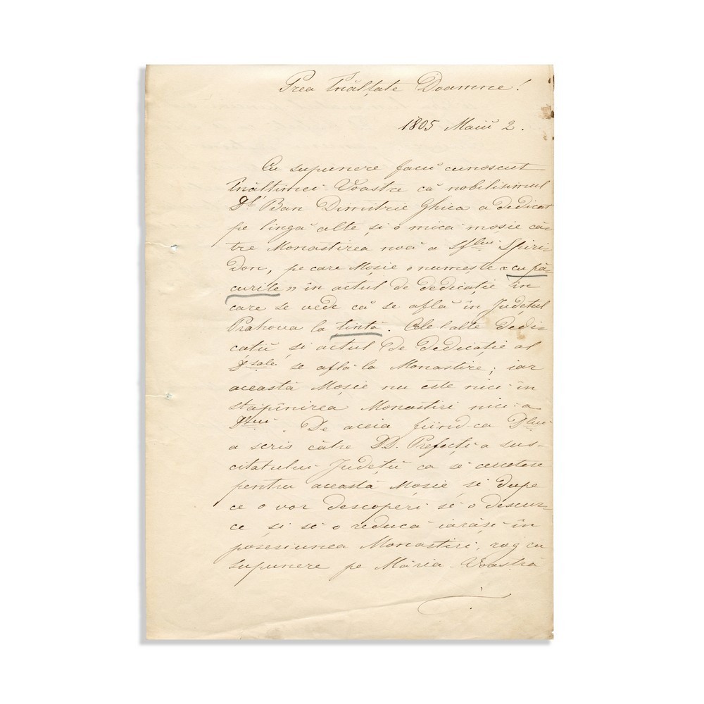 Document adresat de Ioniță Racotă lui Nicolae Clucer, epitropul mănăstirii Spiridon, prin care explică situația în care se afla din pricina unei datorii de 680 de lei. Acesta cere ajutorul unchiului său, logofătul al treilea, Cantacuzin, cu un împrumut de 2000 de lei pentru a putea înapoia datoria și pentru a-și renova locuința. Documentul poartă semnătura ministrului „Treritorilor Streine ale Terrii Rumânești”, Dimitrie Bolintineanu, precum și sigiliul și ștampila Ministerului. Textul este redactat recto-verso pe 4 coli veline, fiind datate 2 iunie 1861. Document emis de Dimitrie Ghica prin care explică modul în a intrat în posesia moșiei „cu păcurile”, despre modul în care a donat-o, acolo fiind ridicată acum noua mănăstire Spiridon. Dimitrie Ghica solicită prefecților județului Prahova să intervină pentru a-l ajuta epitropul locului. Documentul este redactat recto-verso pe două coli veline, fiind datat 1 aprilie 1865. Document emis de către Nicolae Clucer, epitropul mănăstirii Spiridon, în care discută despre donația moșiei „cu păcurile” făcută de Dimitrie Ghica. Documentul este redactat recto-verso pe o coală velină îndoită, fiind datat 2 mai 1865. Document trimis de către Ioniță Racotă lui Nicolae Clucer, epitropul mănăstirii Spiridon, prin care discută despre ipoteca moșiei Măgureni și a moșiei „cu păcurile” pe care era ridicată mănăstirea Spiridon. Documentul este redactat recto-verso pe o coală velină îndoită, fiind datat 17 decembrie 1865.