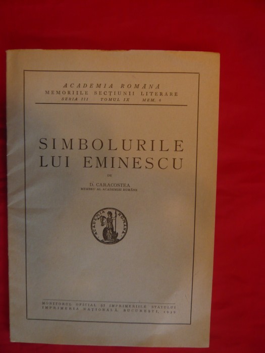 D.CARACOSTEA - Simbolurile lui EMINESCU - 1939 Ed.Academia Romana 20 pag pe hartie filigranata