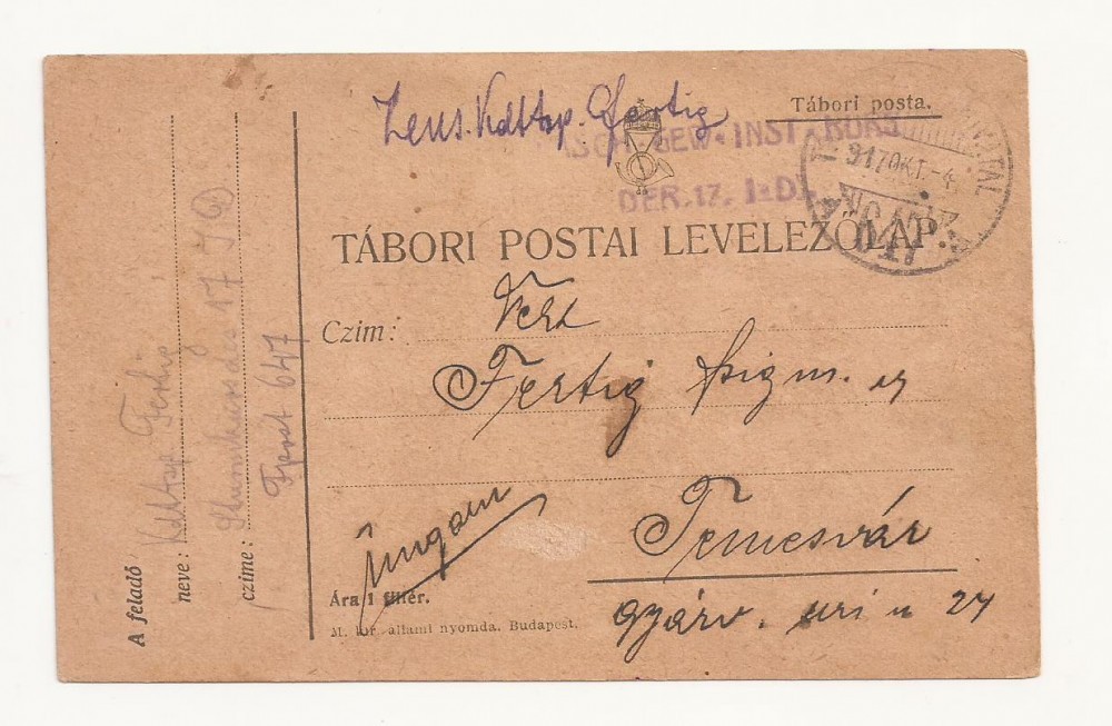 D2 Carte Postala Militara k.u.k. Imperiul Austro-Ungar ,1917 , Temesvar