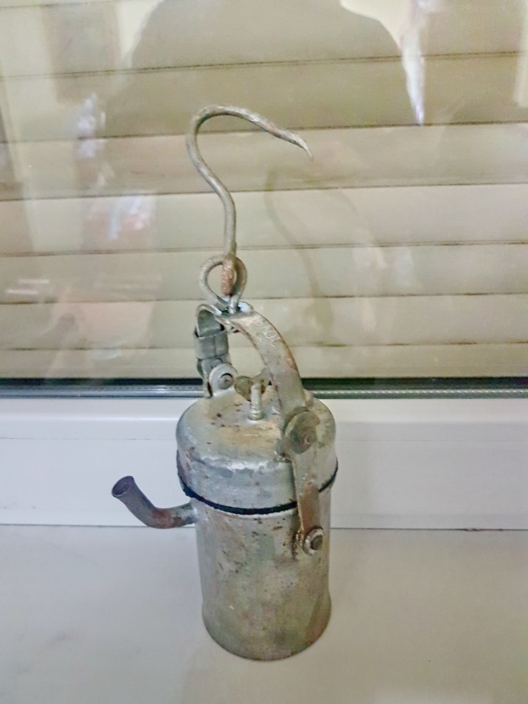 D232-Lampa miner carbit veche Romania metal. Inaltime 22 cm, diametrul 8 cm, adancime 12 cm. Stare buna in patina timpului.