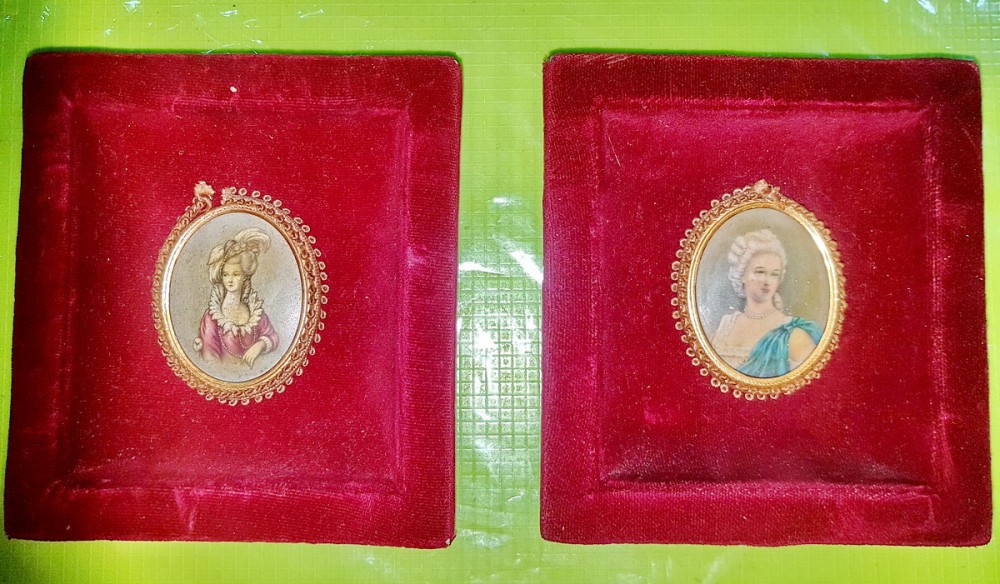 D248-Set 2 Aplice foto vechi-Doamne in costume de epoca anii 1900. Pe lemn imbracat in catifea de purpura si medalioane in oval in metal aurit, sticla din plastic. Marimi: 13/12 cm, medalioanele 6/5 cm, spate din lemn. Stare foarte buna.