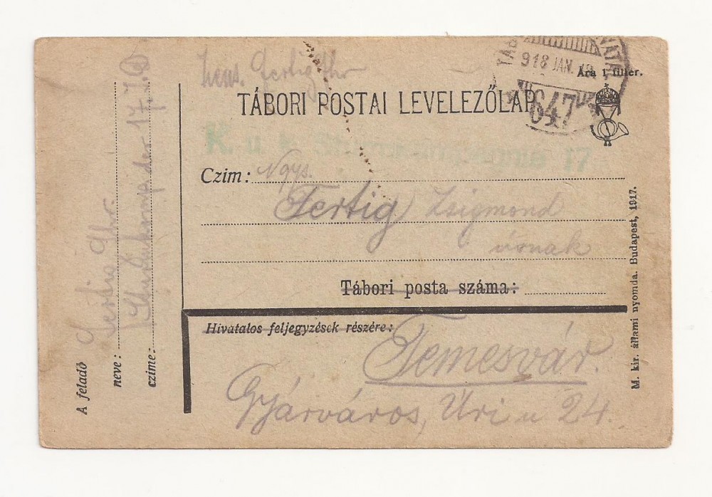 D4 Carte Postala Militara k.u.k. Imperiul Austro-Ungar ,1918 Temesvar, TImisoara