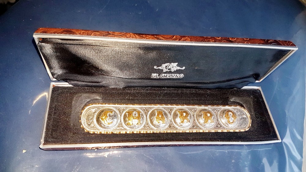D696-Reclama firma EL CHARRO Mexic alama argintata si aurita. Marimi: 16.5/ 2.8 cm. Stare buna in cutia metalica originala cu imitatie piele.