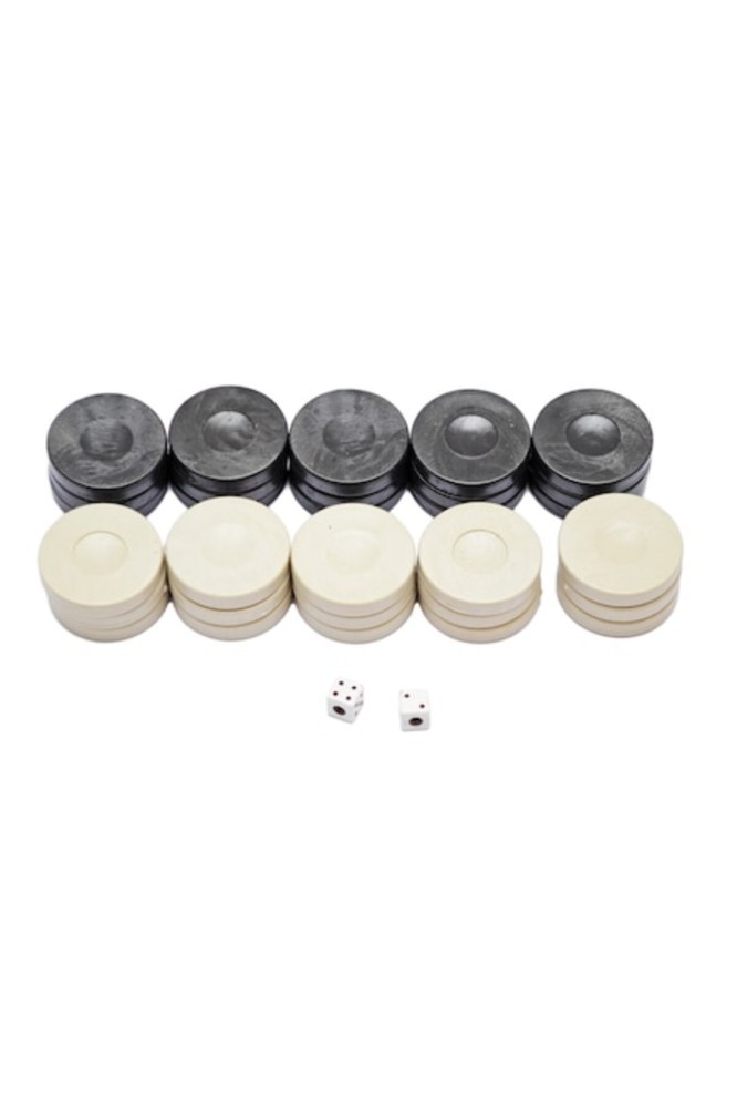 Set de dame de schimb pentru jocul de table; Include zaruri; Diametru: 3,5 cm; Caracteristici suplimentare: pliabil, potrivit pentru 2 jucători, fabricat din plastic; Culoare: alb, negru; Dimensiuni: lungime 26 cm, lățime 26 cm.