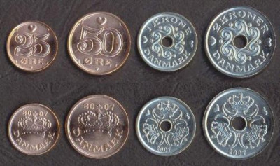 DANEMARCA █ SET DE MONEDE █ 25, 50 Ore, 1, 2 Kroner █ 2007 █ UNC