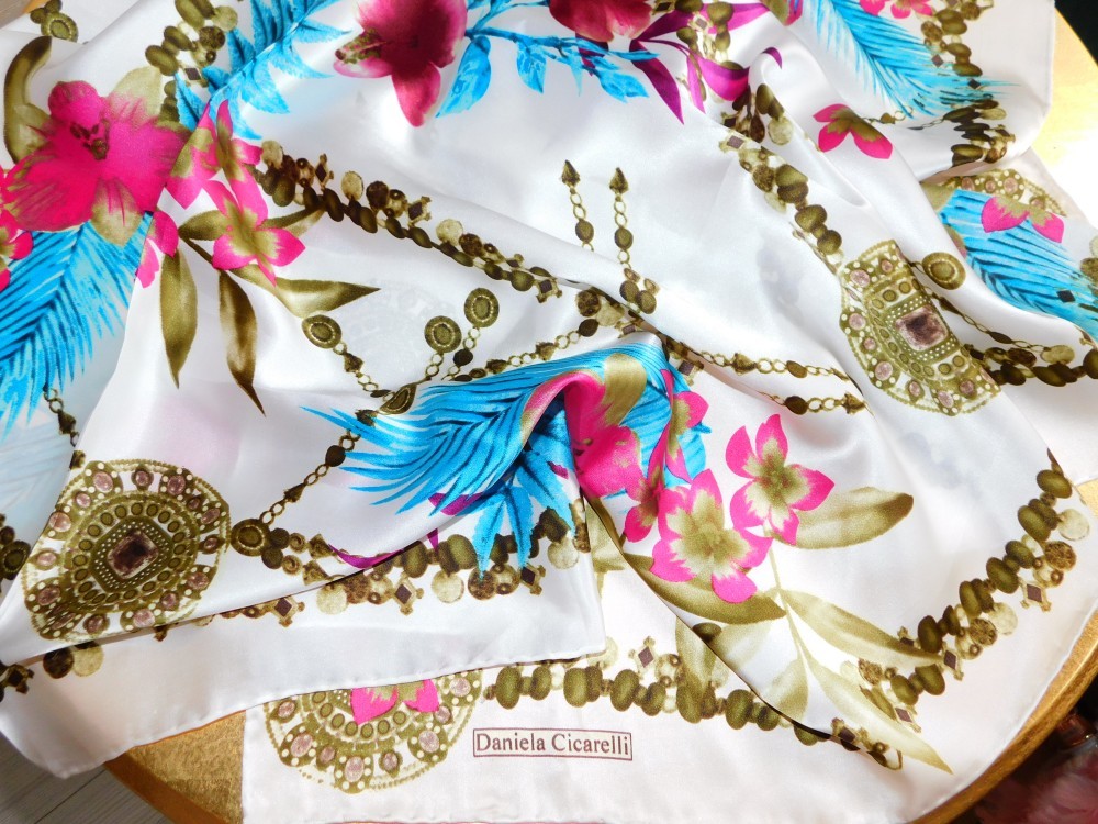 Daniela Cicarelli designer, esarfa noua 50 % matase naturala 50 % matase vegetala , tiv manual , 90 x90 cm, foarte fina m matase plina , produs nou , fara eticheta din magazin .