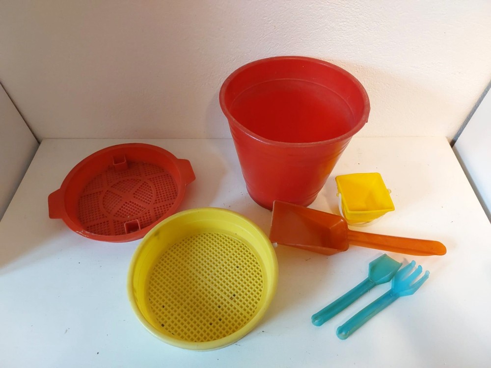 Jucarie veche romaneasca set pentru joaca in nisip / pentru plaja - galetuta de plastic + accesrii: Lopatica mare (rosie), lopatica si grebla mai mici albastre, galetuta galbena, sita mare galbena si sita mare rosie;