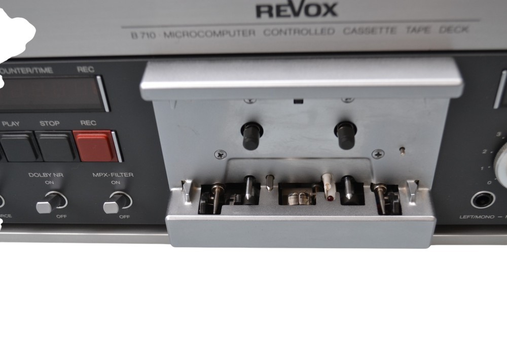 Deck Revox B 710 HiEnd : pe 3 capete, iesiri si intrari balansate, Microcomputer Controlled Stereo Tape Deck , poze reale, incarcare centrala, Counter, Dolby B,C, VUmetere, Calibration, iesire casti cu volum separat, MP Filter, tape selector, digital, poze reale, capac peste caseta, made in West Germany.