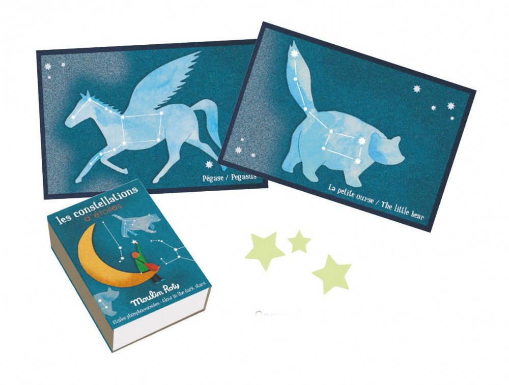 Setul conține steluțe fluorescente și cartonașe pentru a recrea pe pereți și tavan 10 dintre constelațiile cele mai cunoscute..sau cele imaginate de tine.