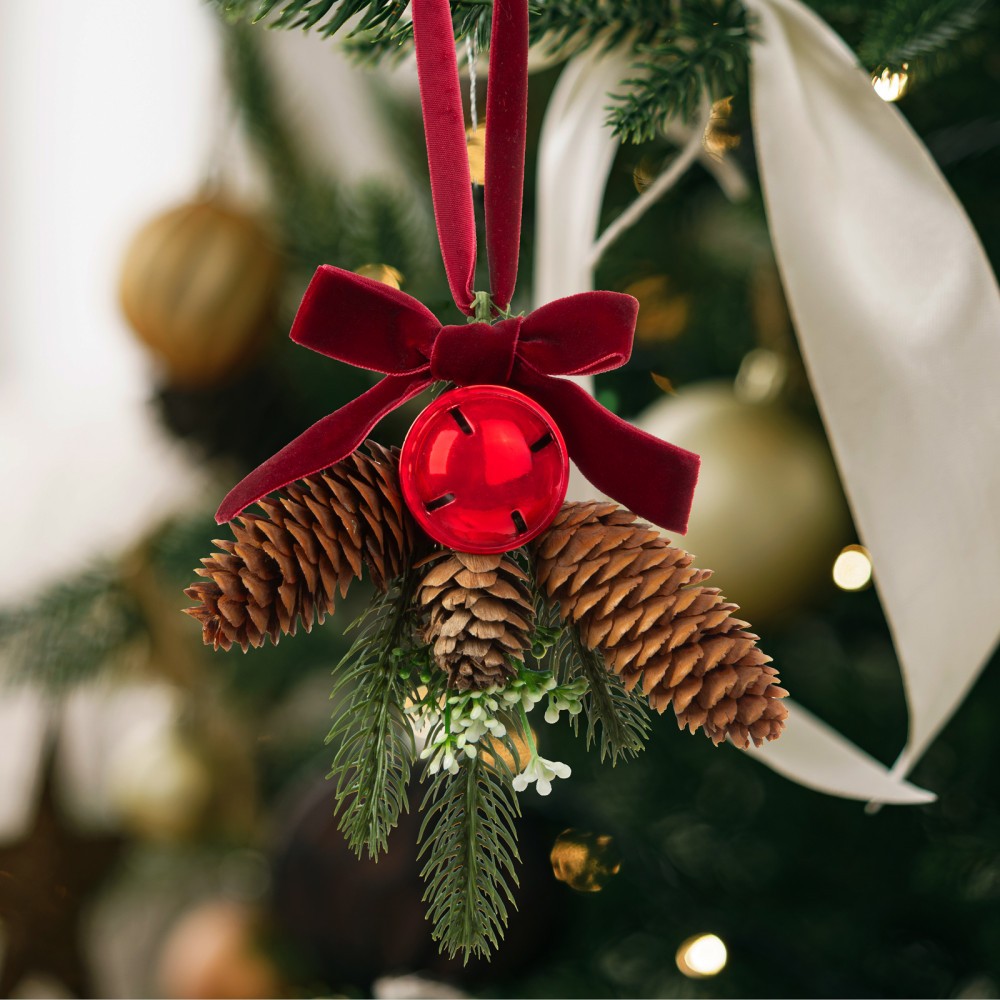 conuri, clopotel rosu stralucitor si panglica. Cu culoarea verde