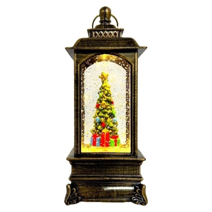 Decoratiune luminoasa si muzicala cu tematica de Craciun, tip felinar, cu brad impodobit si cadouri, din metal si plastic, maro