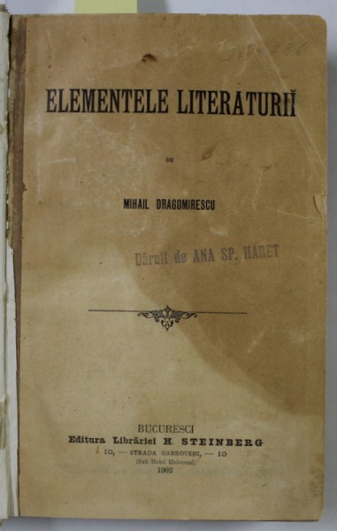 DEDICATIA LUI MIHAIL DRAGOMIRESCU PENTRU SPIRU C. HARET , PE VOLUMUL ' ELEMENTELE LITERATURII ' , 1902
