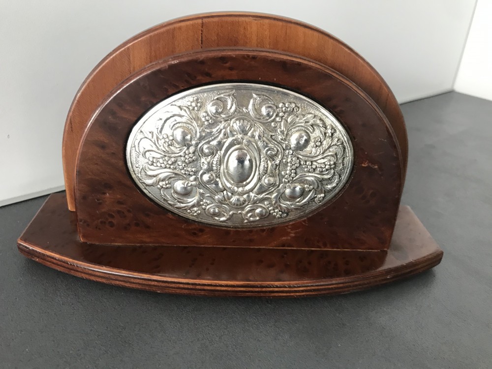Deosebit Suport pentru servetele vechi,Lemn si alama argintata in basorelief.