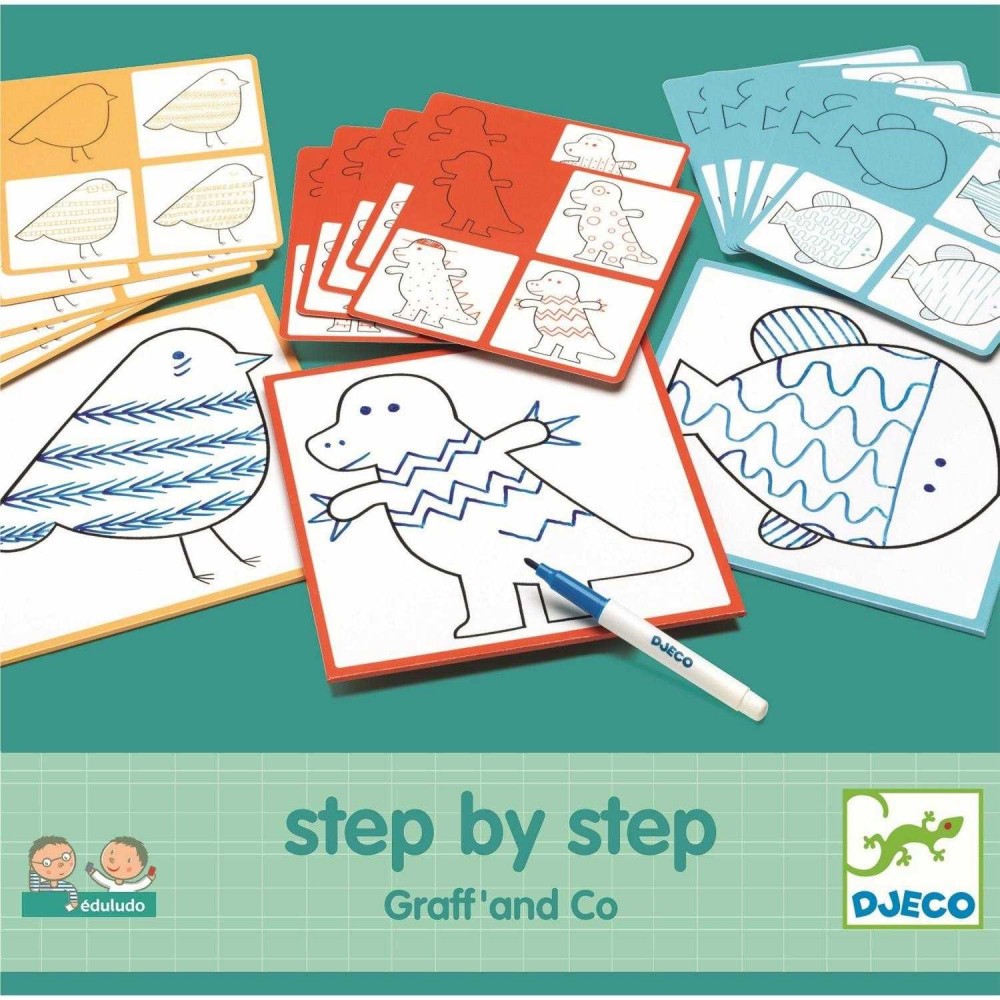 Latime: 22 cm si lungime: 22 cm. Varsta recomandata: +3 ani. Trasezi intai o linie dreapta apoi curbata si tot asa..pana obtii diferite modele grafice care te vor inspira pe viitor. Invatam sa desenam pas cu pas cu atelierul creativ grafic de la Djeco. Setul contine: o plansa de baza pe care se deseneaza o carioca burete de sters 30 cartonase care arata modele diferite de decorare grafica. Confectionate din materiale non toxice conform EN71 & ASTM. AVERTISMENT: Contraindicat copiilor mai mici de 3 ani contine piese mici. A se folosi sub stricta supraveghere a unei persoane adulte. Producator: D jeco F ranta
