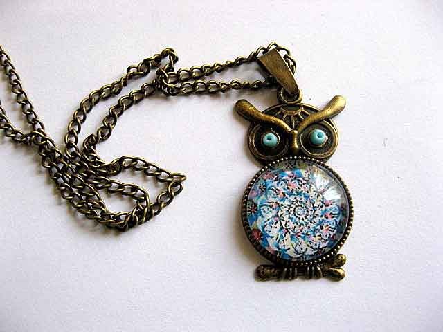 Design spirala culori multicolore estompate, bijuterie bronz si sticla 29542. O bijuterie colier cu pandantiv din metal si sticla / bronz si sticla cu un design ce poate fi asemanata cu o spirala multicolora, in culori estompate: roz, albastru, blue, alb, verde deschis / vernil, etc. Bufnita sta pe o ramura de copac, iar ochii ei sunt de culoare verde deschis / vernil. Inaltimea pandantivului este de 40 mm.