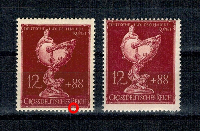 Eroare: cadrul exterior este intrerupt sub litera R din Reich. Mi 903 I, MNH, cota de catalog: 30EUR. Lotul contine o marca cu eroare si o marca normala.