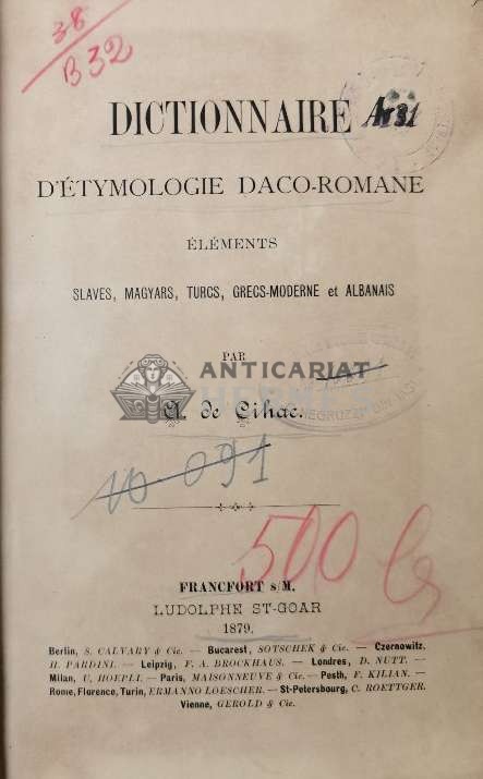 Cartea "Dictionnaire d'etymologie daco-romane", scrisă de A. de Cihac, a fost publicată de editura Francfort în anul 1879. Aceasta are 816 pagini și este disponibilă cu copertă cartonata. Exemplarul se prezintă într-o condiție buna. Anticariatul Hermes vă pune la dispoziție cartea "Dictionnaire d'etymologie daco-romane" de A. de Cihac la un preț competitiv. Comandați acum și beneficiați de livrare rapidă prin curier. "Dictionnaire d'etymologie daco-romane" de A. de Cihac este inclusă în oferta noastră diversificată, cu stoc disponibil pentru expediere imediată. La Anticariatul Hermes găsiți o gamă largă de cărți, viniluri și antichități din toate domeniile, la cele mai avantajoase prețuri. Detalii despre carte: - Titlu: Dictionnaire d'etymologie daco-romane - Autor: A. de Cihac - Editura: Francfort - Anul publicării: 1879 - Număr de pagini: 816 - Tip copertă: Cartonata - Categorie: Dictionare & Limbi straine - Stare: Buna Explorați colecția noastră variată de cărți din categoria Dictionare & Limbi straine și descoperiți comori literare la Anticariatul Hermes!