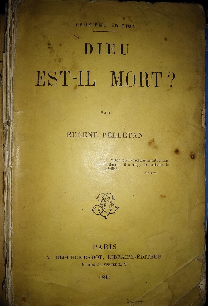 Dieu Est-Il Mort ?, de Eugene Pelletan, editura A. Degorge-Cadot, Paris, 1883, 312 pagini. Stare bună. Text în limba franceză. Pentru București fac predare personală. Pentru alte localități 11 ron taxe postale cu ramburs sau 6 ron colet simplu cu plata prin virament bancar. Pentru produse comandate în valoare de 50 ron trimit gratis colet simplu sau 5 ron cu ramburs, iar la 100 ron comanda expediez gratis cu ramburs.