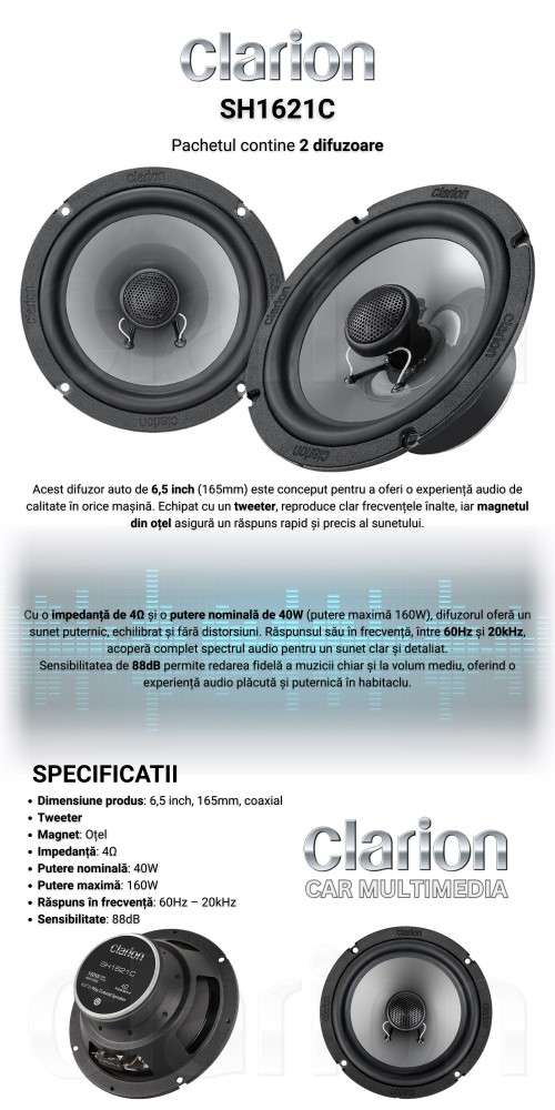 Difuzoare Auto Clarion, SH1621C, Set coaxiale 2 cai, 6,5 inch, 40W RMS, 4Ω