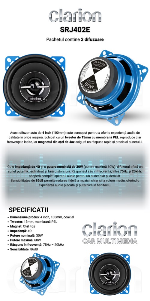 Difuzoare Auto Clarion, SRJ402E, Set coaxiale 2 cai, 100mm, 30W RMS, 4Ω, 2