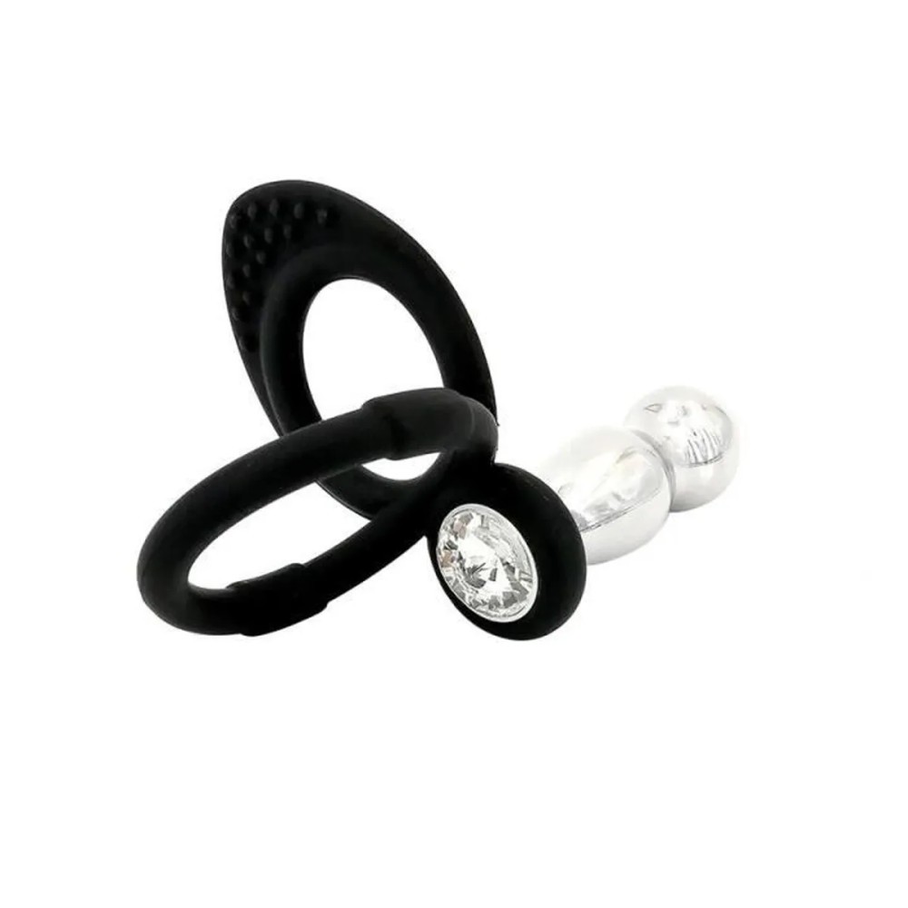 Dildo anal metalic prevazut cu design ce ofera o stimulare intensa. Dispune de baza detasabila care este decorata cu o piatra transparenta. Vine la pachet cu un inel dublu pentru penis si testicule. Inelul este detasabil de dildo si este realizat din silicon. Dimensiuni:- lungime 6.6 cm;- diametrul 3.2 cm. | Material: Metal + Silicon | Lungime: 6.5 cm | Diametru: 3 cm | Greutate: 86 g | Culoare: Argintiu/Negru
