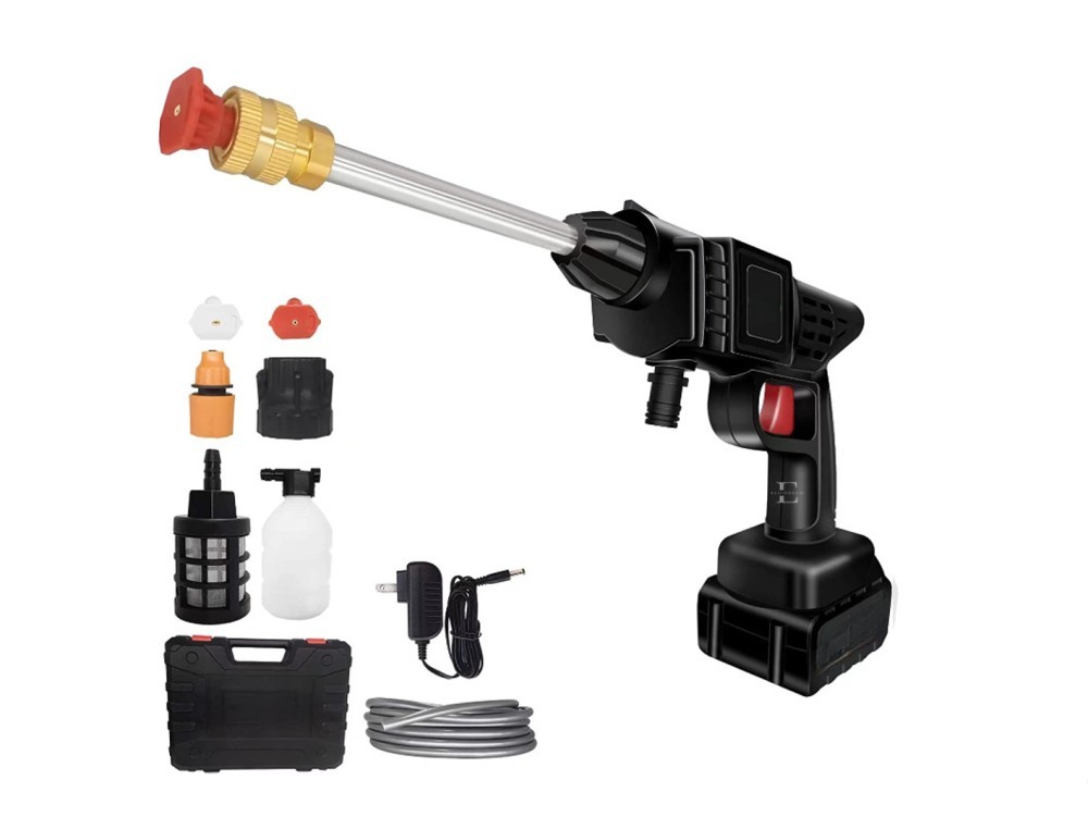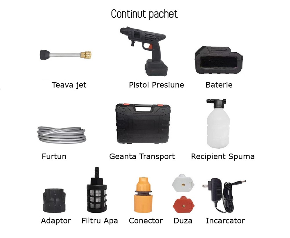In kitul de baza este inclus un dispozitiv de curatare care este echipat cu 2 duze multifunctionala o extensie, cablu de incarcare acumulator cu conectare auto, un bidon pentru solutie de spalat, acumulator 24 v si o duza conectare furtun. Presiunea de operare poate fi reglata, astfel incat sa fie posibila atat curatarea usoara, cat si cea puternica. Un furtun de aspiratie trage lichid din orice sursa fie ca este galeata, lac sau robinet. Datorita adaptorului pentru sticla PET inclus, apa poate fi utilizata de la orice sticla de plastic.