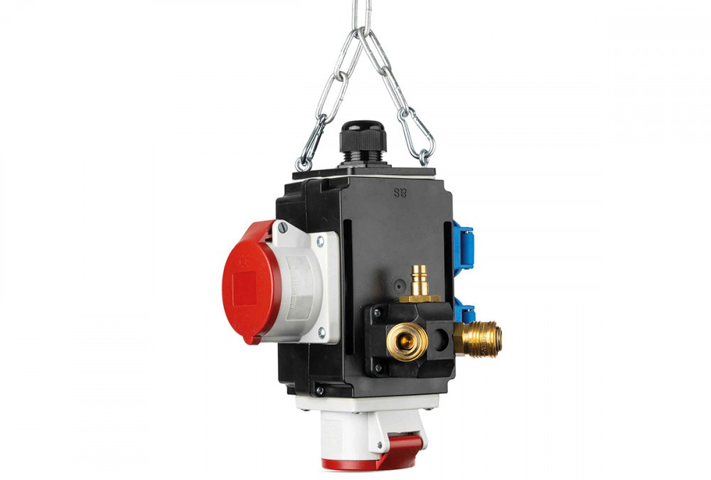 Distribuitor de energie suspendat 2 prize trifazice 400V 5 poli 16A IP44 si cu 2 prize monofazice schuko 16A IP44 cu conexiune la aer comprimat Intrare: Diametrul cablului de la 5x2,5 mm2 la 5x4 mm2 Iesire: 2x prize cu impamantare 230 V, 16 A 2x prize CEE 400 V, 16 A, 5 pini Cu racord de aer comprimat Disponibil si cu conexiune de date: 2x RJ45 Cat. 6 module IP67 Carcasa din plastic special foarte rezistent la rupere Cablat, gata de conectare Inclusiv intrare de cablu cu capac cu surub si lant cu carlig Toate cuburile de energie fara priza de date au un carlig practic multifunctional pe o parte IP44: protejat impotriva corpurilor straine si stropilor de apa