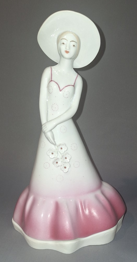 Doamnă cu pălărie largă și rochie lungă, ținând un buchet de flori (porțelan românesc Alba Iulia)