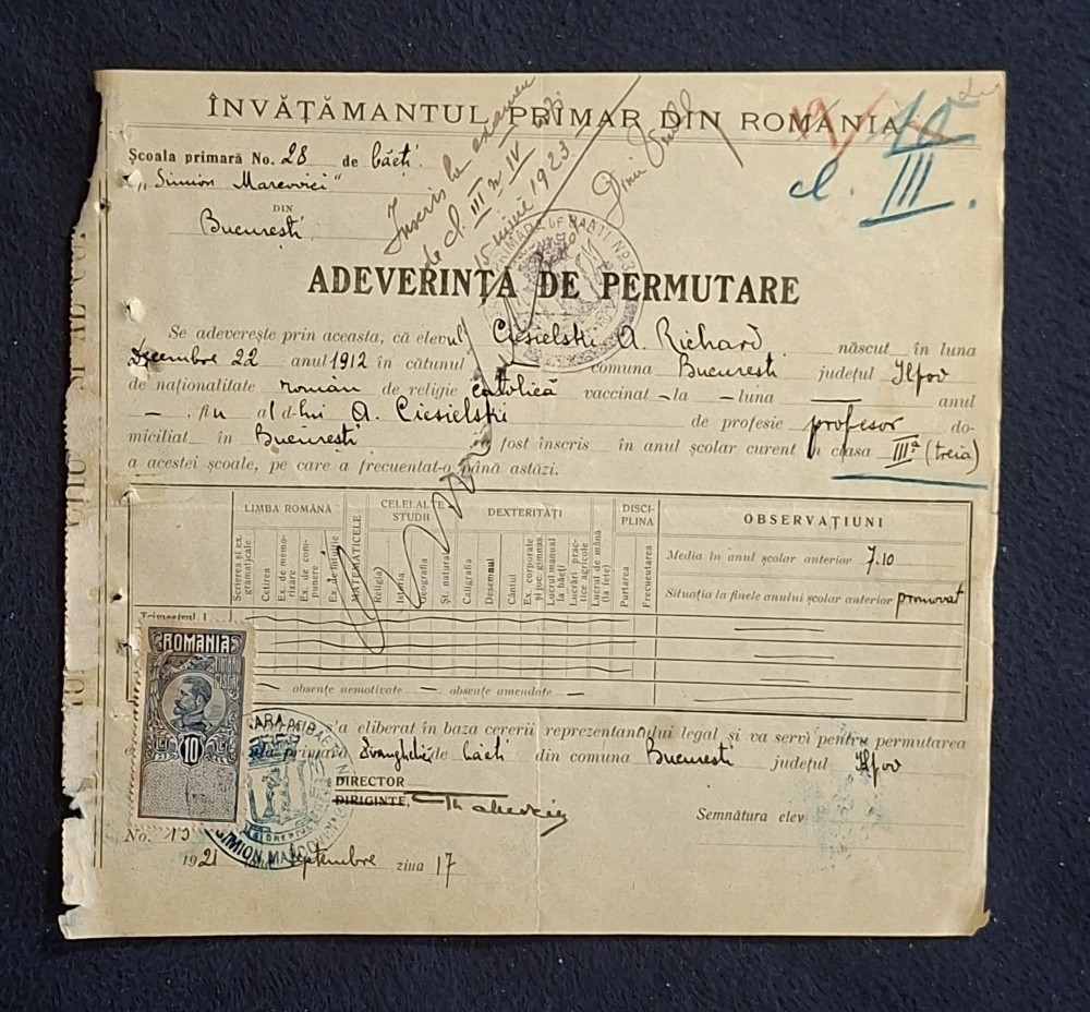 Document Adeverinta de permutare 1921