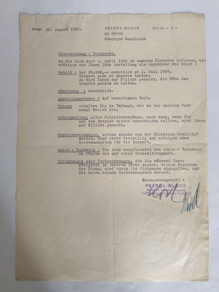 Document emis de Petrol - Block, Rafinaria Standard Ploesti 1940 / CD1P