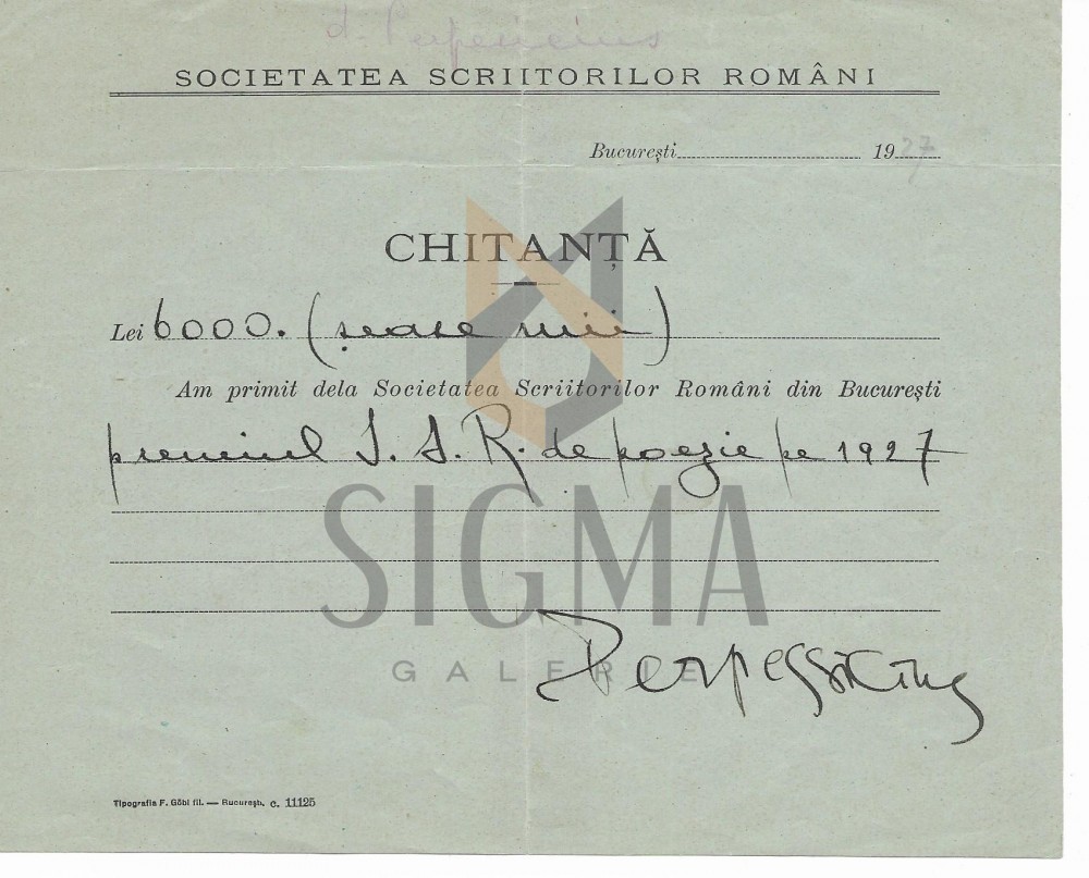 17 CM X 21 CM , CHITANAT SCRISA, SEMNATURA ORIGINALA, PERPESSICIUS, LA PRIMIREA SUMEI DE 6000 LEI PENTRU PREMIUL OBTINUT IN 1927 SOCIETATEA SCRIITORILOR DIN ROMANIA.