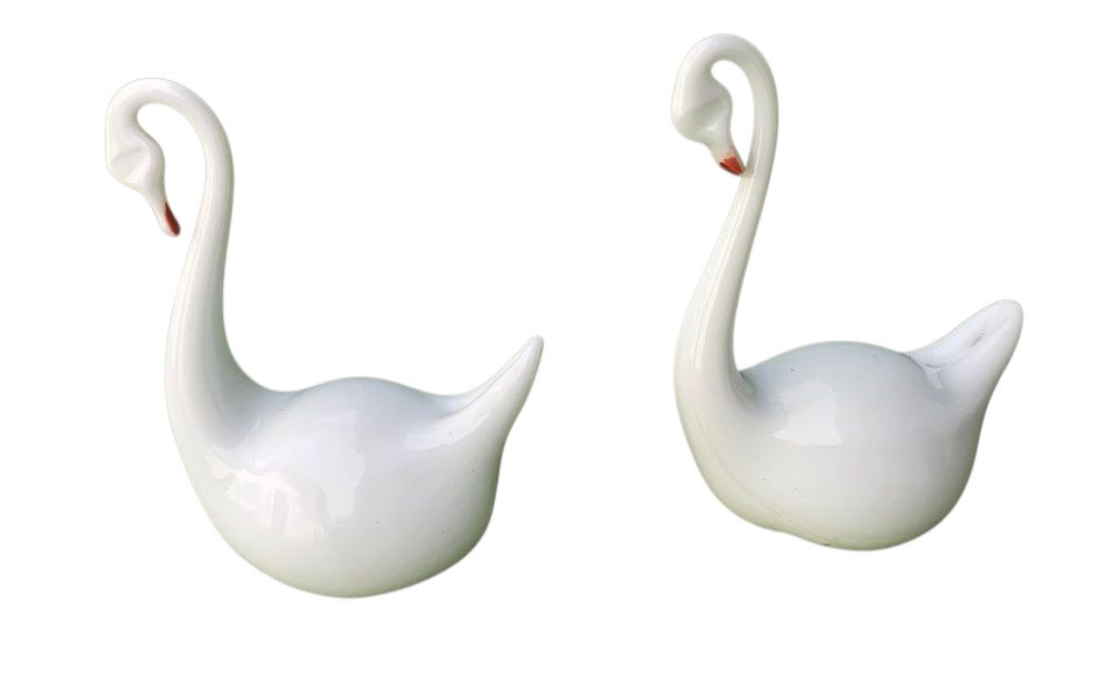 Două figurine, model stilizat lebede din sticlă alb-lăptoasă, lucrate prin modelare manuală, având corp compact, formă fluidă și gât înalt curbat, finisate cu detalii pictate manual pe cioc.