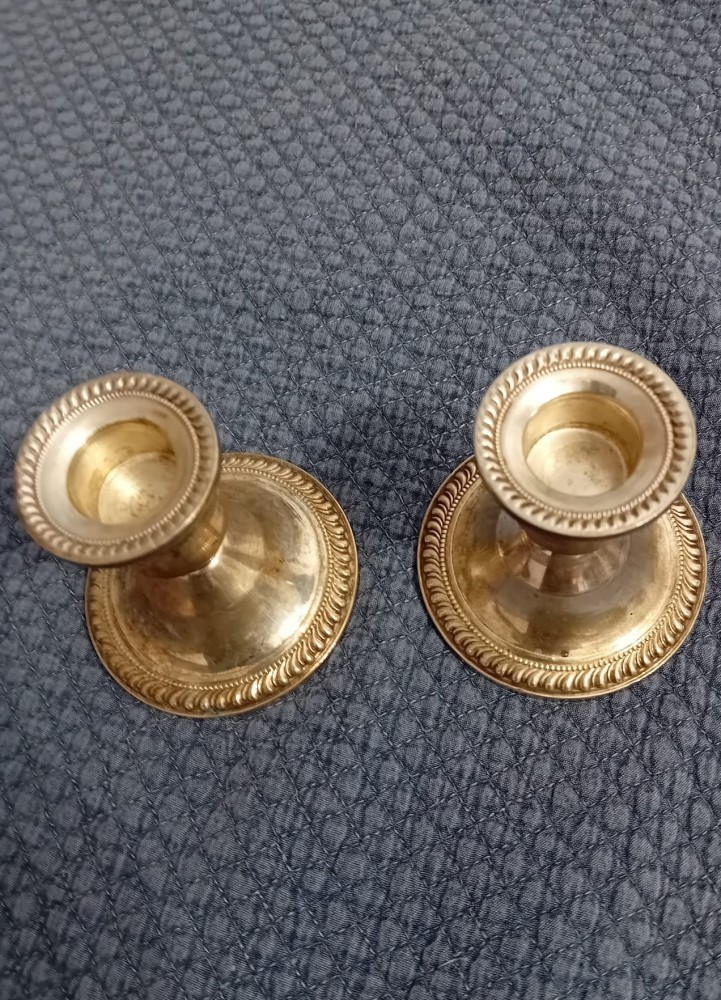 Doua suporturi de lumanare din argint 925 din tabla, pentru ca are umputura. Marcajul la fund STERLING DUCHIN CREATION WEIGHTED , dar au si un marcaj lateral de import austrian si cifra 925. Cu inaltimea de 7 cm, folosite in stare bune