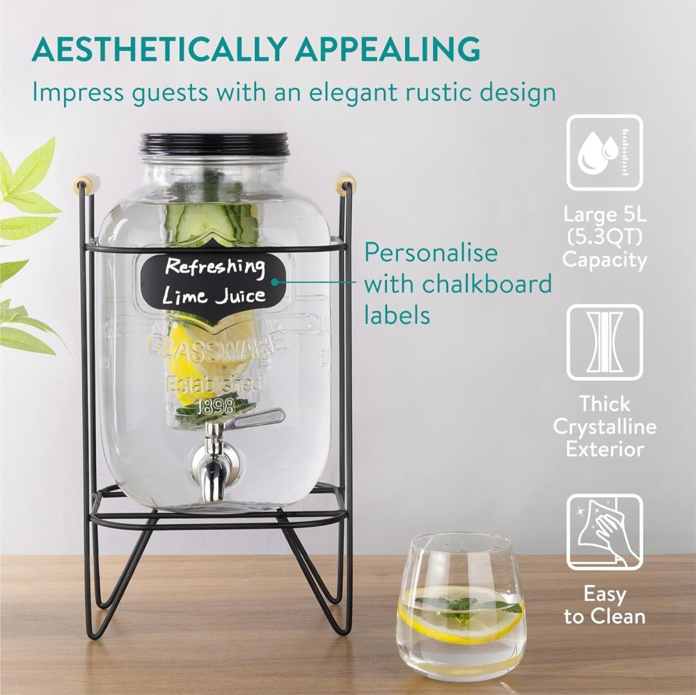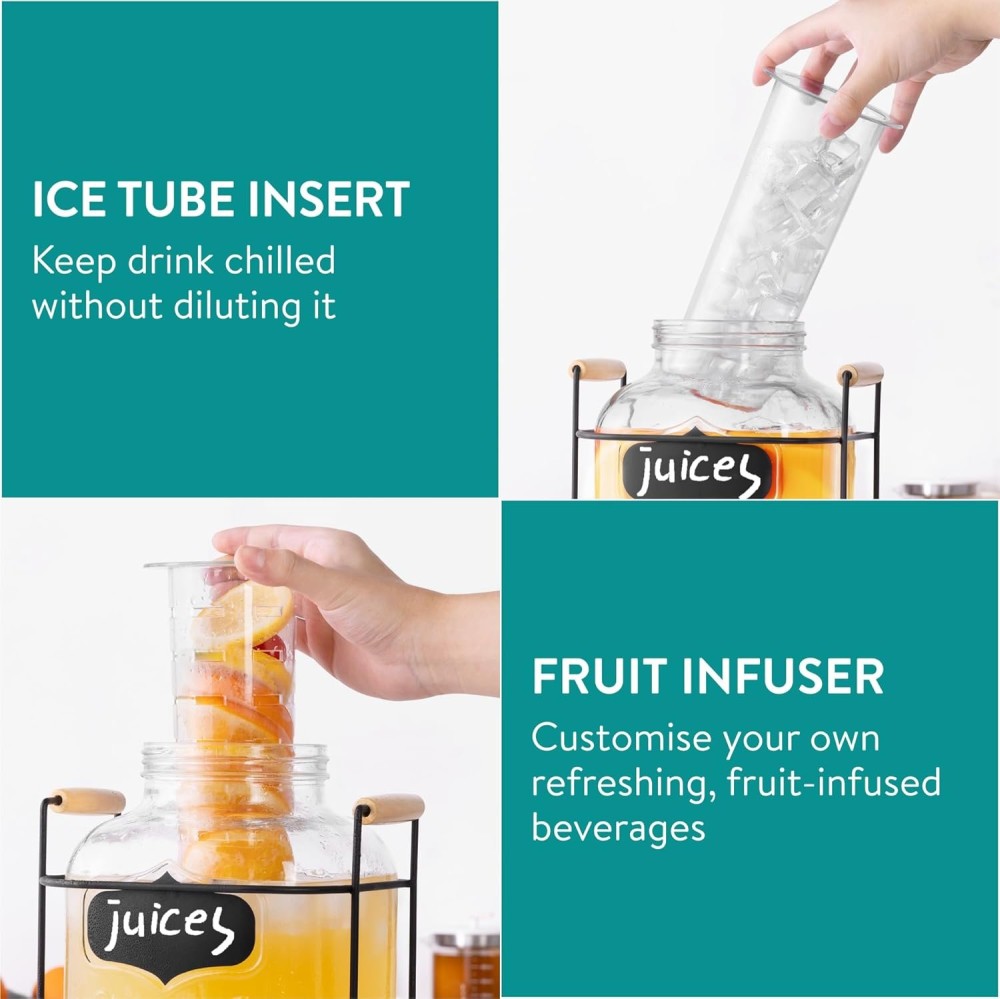 Acesta este echipat cu un recipient mare din sticlă, cu capacitatea de 5 litri, oferindu-vă posibilitatea de a servi băuturi preferate. Construit din sticlă soda-lime groasă și rezistentă, este transparent și durabil, iar inserția pentru fructe adaugă un plus de aromă băuturilor dumneavoastră.