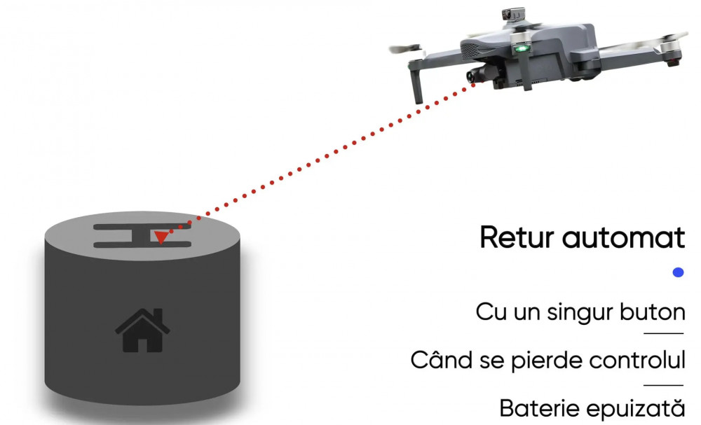 Functia de retur automat garanteaza intoarcerea in siguranta a dronei la punctul de decolare in situatii de urgenta, eliminand riscul de a pierde drona.