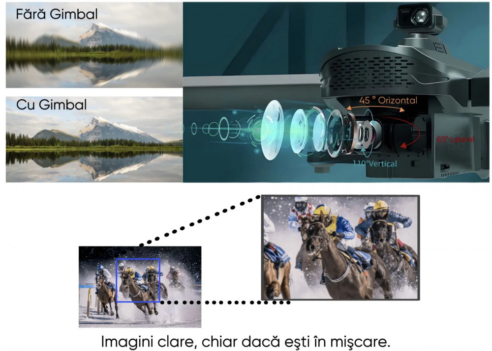 Camera duala include un gimbal pentru stabilizare ce confera fotografiilor si videoclipurilor claritate, chiar daca esti in miscare. Fotografiile 4K Ultra si videoclipurile fluide la calitate Full HD vor fi mereu la indemana.