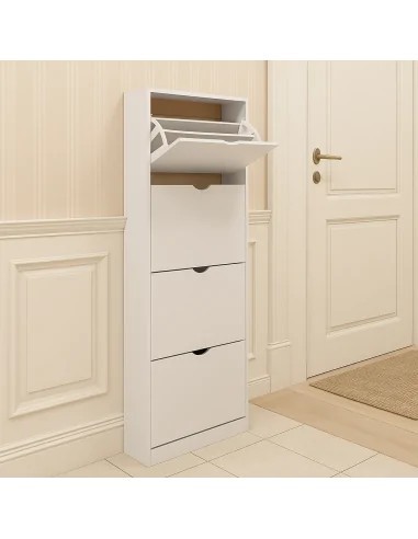 Dulap pentru depozitare pantofi KL Carey, 4 compartimente, usi rabatabile, 8 rafturi, Pal Melaminat, alb
