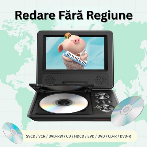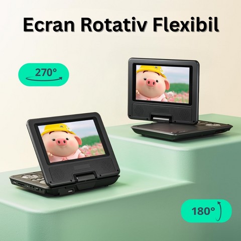 🎬 DVD Player Portabil 7.5" cu Telecomandă – Ecran Rotativ HD, Suport USB/SD/CD/DVD, Funcție Memorie, Încărcător Auto, Difuzoare Stereo – Ideal pentru Călătorii și Copii