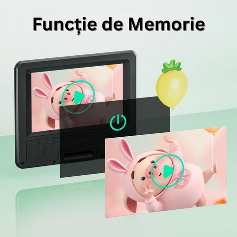 Bucură-te de filme, muzică și divertisment oriunde ai merge! Playerul DVD portabil de 7.5 inch este partenerul perfect pentru drumuri lungi, vacanțe, timp liber acasă sau distracția celor mici fără internet sau dispozitive inteligente. Cu un design compact și ecran rotativ, redare clară, sunet puternic și compatibilitate largă, acest player este alegerea ideală pentru toți membrii familiei.
