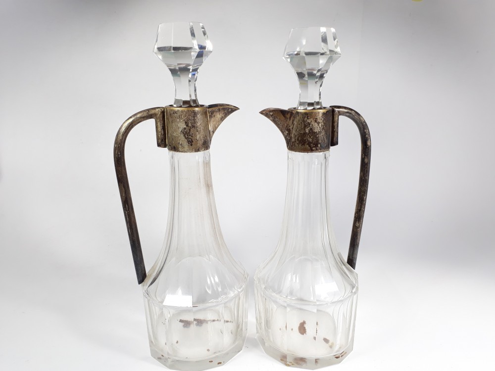 Pereche de sticle vechi cristal slefuit cu maner de alama argintata Art Deco.