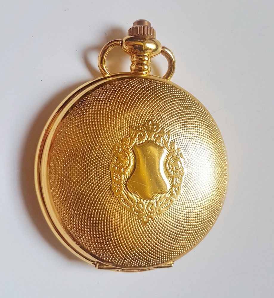E138- Ceas buzunar barbat quartz monograma H si stema functional metal aurit gravat. Diametrul 5 cm. Stare foarte buna, aproape nou.