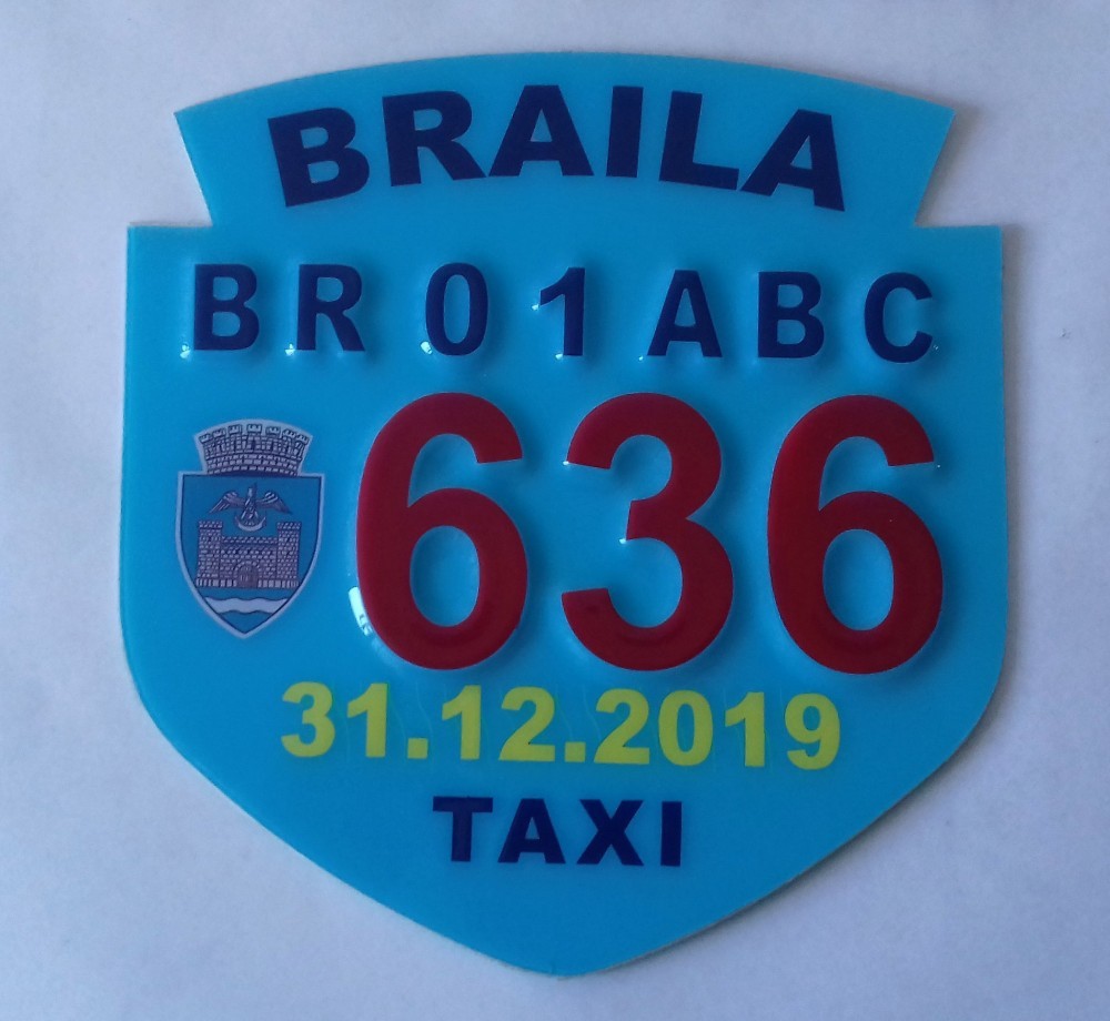 Ecusonul taxi este din placa PVC imprimat in oglinda si contine urmatoarele elemente: - denumirea orasului - serviciul autorizat taxi - numarul de autorizatie in relief - numarul de inmatriculare a autovehiculului in relief - data expirarii a autorizatiei cu element de siguranta - stema orasului. Culoarea fondului si a inscrisurilor se alege de beneficiar.