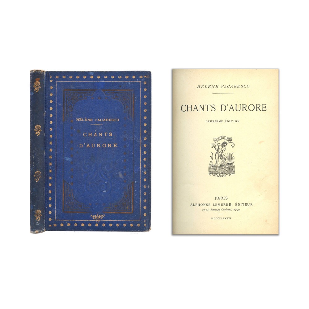 Elena Văcărescu, Chants d'Aurore, Paris, Alphonse Lemerre, Editeur, 1886, 122 p. La începutul volumului regăsim dedicația scriitoarei. Legătură originală de editură.