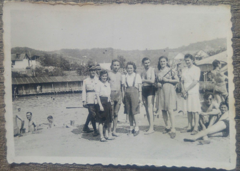 Elev militar cu tinere la strand// fotografie perioada interbelica