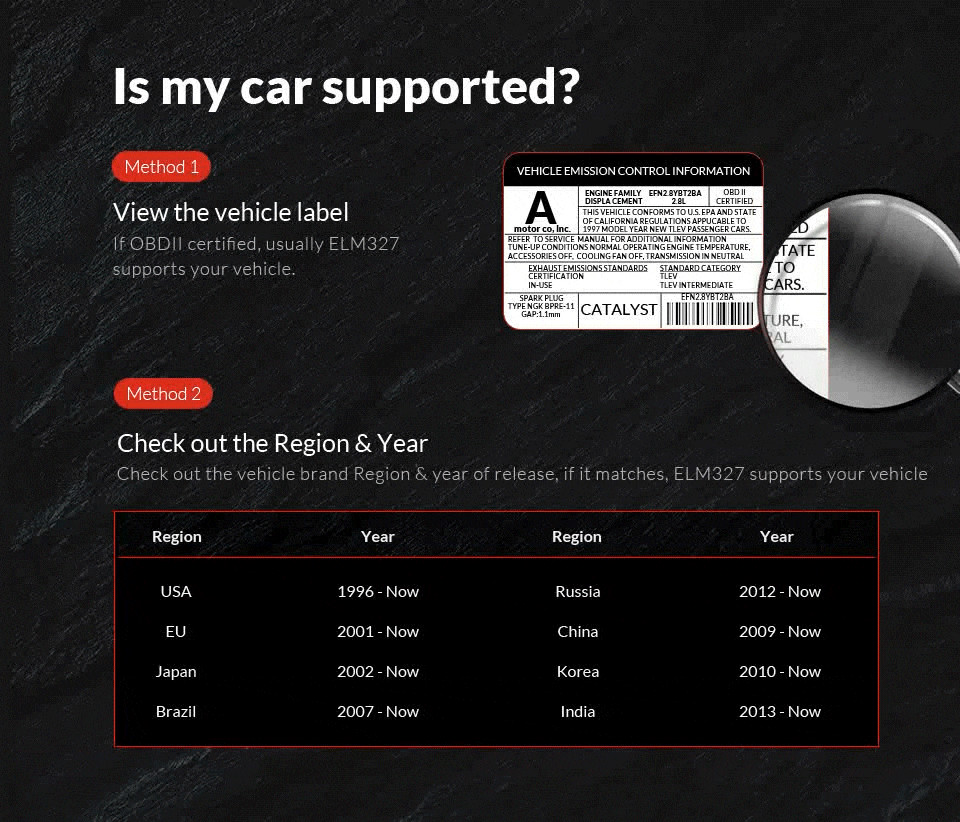 Works on almost OBD2 Vehicles (1996 onwards in USA) and EOBD vehicles (we do not test it on all cars, we can not make sure whether it can be used on your car, maybe you can buy one to have a try. Many thanks.)
