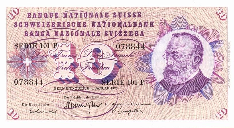 Splendida bancnota de 10 Franken din Elvetia 1977 (P-45u) în stare necirculatã (UNC).