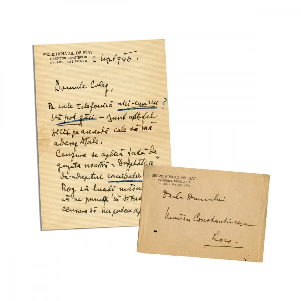 Scrisoare olografă trimisă de Emil Hațieganu unui coleg, Petre Constantinescu-Iași, în care îi menționează că cenzura „se aplică față de gazeta noastră, Dreptatea, de-a dreptul canibalic” și îl roagă să ia măsuri, punându-i la dispoziție articole. Scrisoarea este datată 2 septembrie 1946 și este redactată recto-verso, cu cerneală neagră, pe o singură filă. Textul a fost scris pe o filă cu antetul „Secretariatul de Stat/ cabinetul ministrului/ Dr. Emil Hațieganu”. Se păstrează și plicul în care scrisoarea a fost expediată.